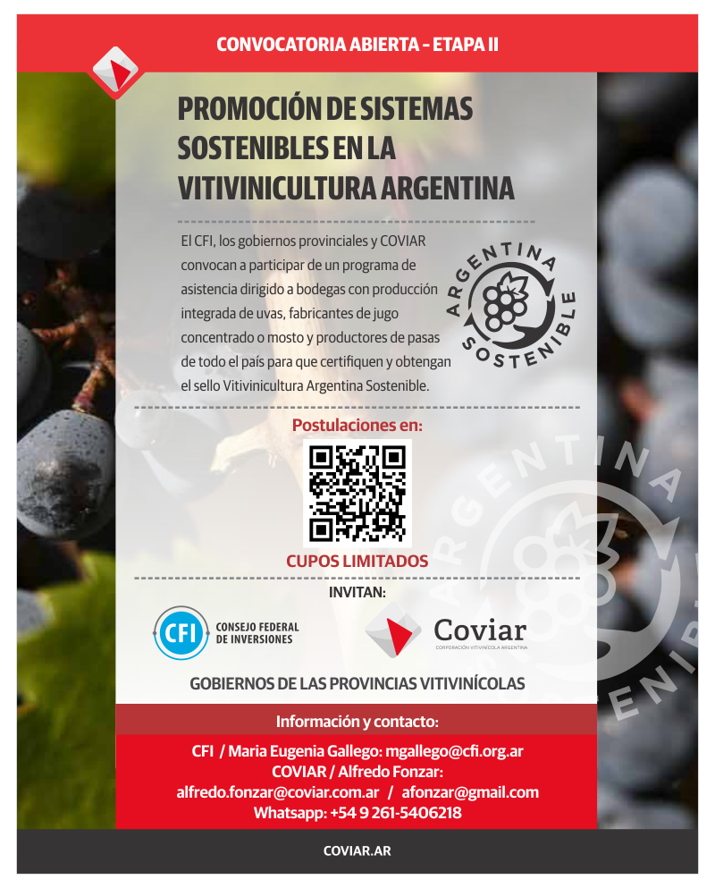 La Corporación Vitivinícola Argentina (COVIAR), el Consejo Federal de Inversiones (CFI) y los Gobiernos de las provincias vitivinícolas de Argentina darán continuidad al segundo ciclo 2025/2026 del programa de “Promoción de Sistemas Sostenibles en la Vitivinicultura Argentina” e invitan a bodegas integradas con producción de uvas, fabricantes de jugo concentrado o mosto y productores de pasas a postularse para participar de esta iniciativa que permitirá certificar procesos y acceder al sello Vitivinicultura Argentina Sostenible.